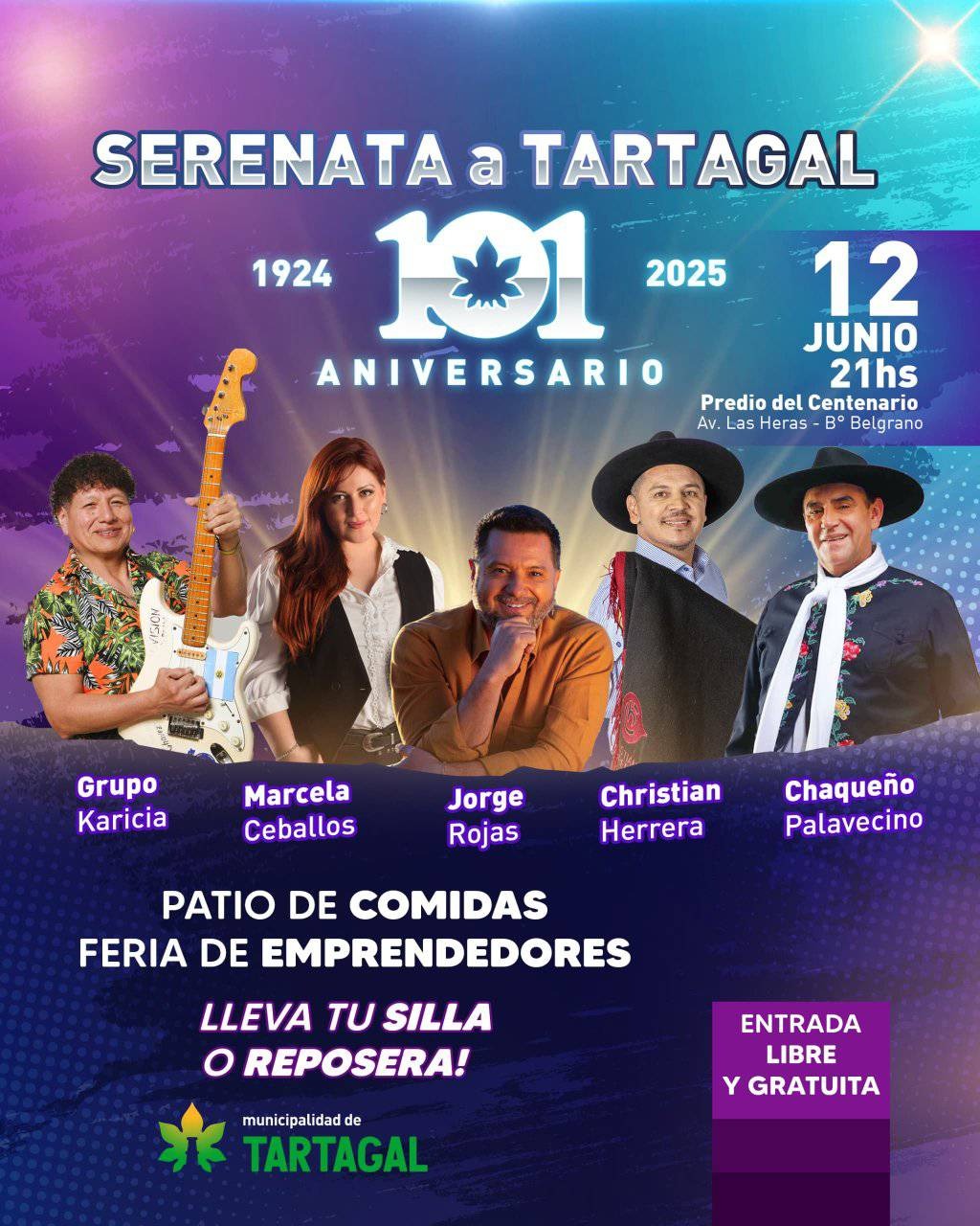 Este 12 de junio, Tartagal se viste de fiesta para celebrar su 101° aniversario con un megashow gratuito que promete ser inolvidable.